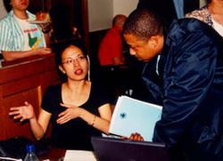 Dennis Chambers looks on as CCTE student Yaowen Chang demonstrates a project during the annual Technology Demo Day. Held in April in the newly renovated Grace Dodge Room, dozens of faculty, staff and students gathered to demonstrate and share their latest forays into educational technology.