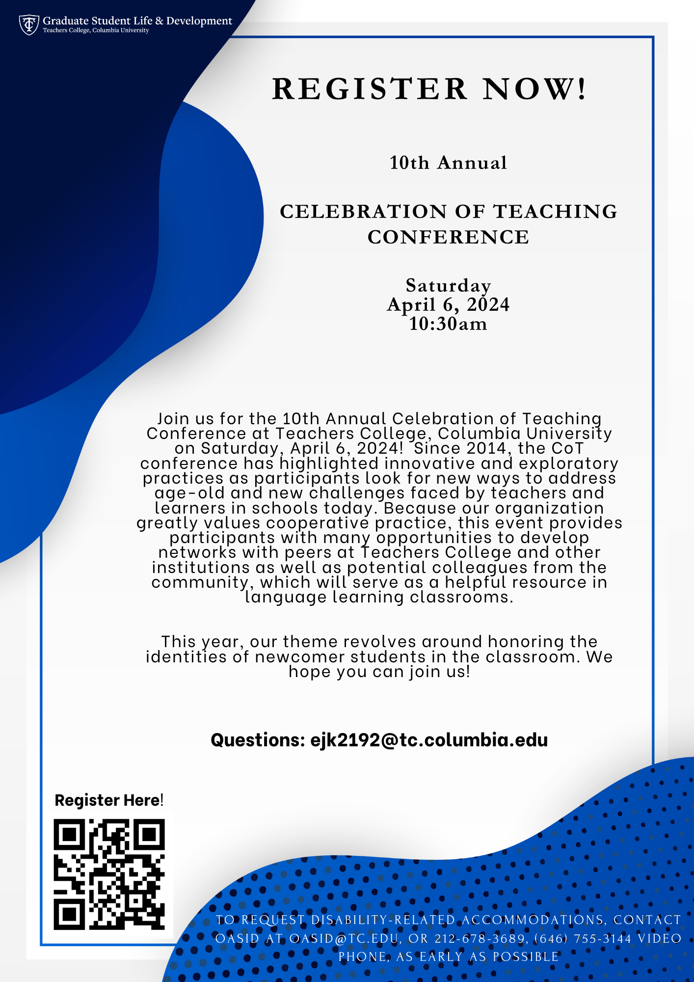 To request disability-related accommodations, contact OASID at oasid@tc.edu, (212) 678-3689, as early as possible.