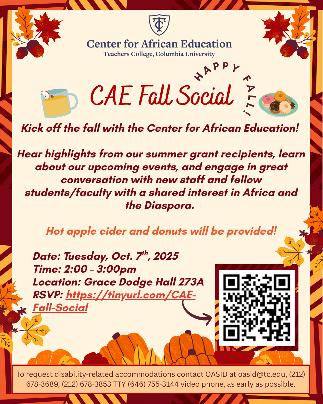 Enjoy hot apple cider and donuts as you learn about upcoming CAE events, listen to presentations from our summer grant recipients, and mingle with students and faculty who are interested in African and Diasporic education!