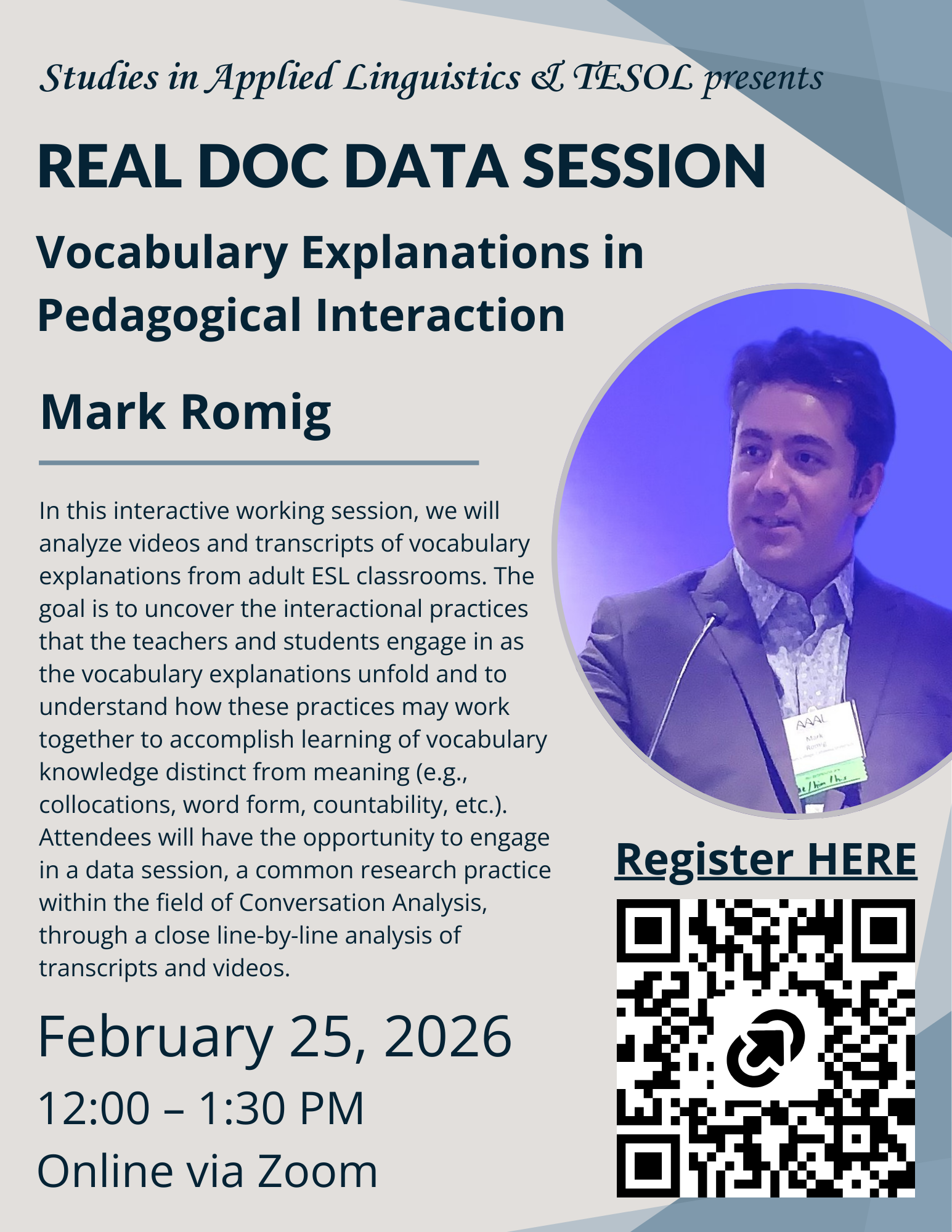 In this interactive working session facilitated by Mark Romig, we will analyze videos and transcripts of vocabulary explanations from adult ESL classrooms. The goal is to uncover the interactional practices that the teachers and students engage in as the vocabulary explanations unfold and to understand how these practices may work together to accomplish learning of vocabulary knowledge distinct from meaning (e.g., collocations, word form, countability, etc.). Attendees will have the opportunity to engage in a data session, a common research practice within the field of Conversation Analysis, through a close line-by-line analysis of transcripts and videos.