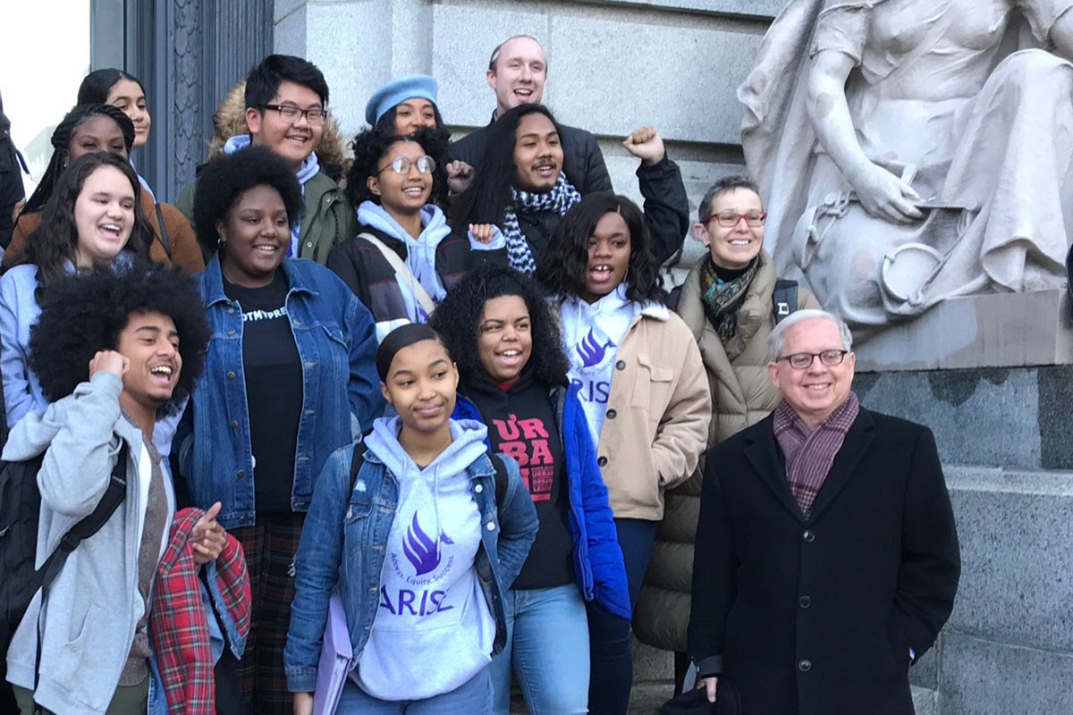 Michael Rebell with Rhode Island students at the state courthouse in 2019. (Photo courtesy of Rebell)