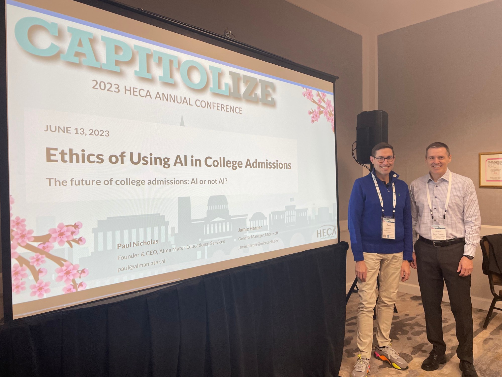 And just a year later, he was invited to share his timely research at HECA 2023, a conference held by the Higher Education Consultants Association. His work not only drew interest among his colleagues but also the attention of Jamie Harper, Microsoft's Vice President of U.S. Education. The two presented together, with Nicholas gaining “valuable insights” from Harper that he'll carry into the future.
