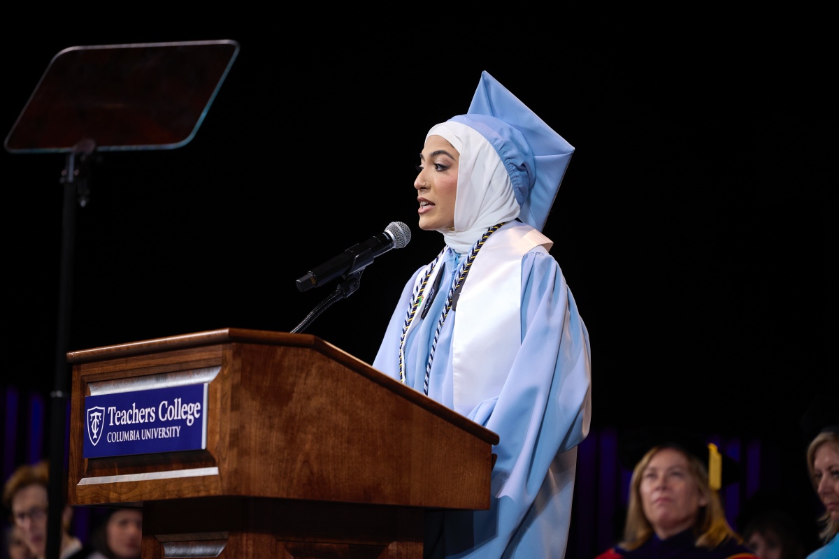 Maya Rajah (M.A. ’24, Psychology in Education) who addressed her fellow graduates during the first of TC's convocation celebrations. (Photo: JD Closser)