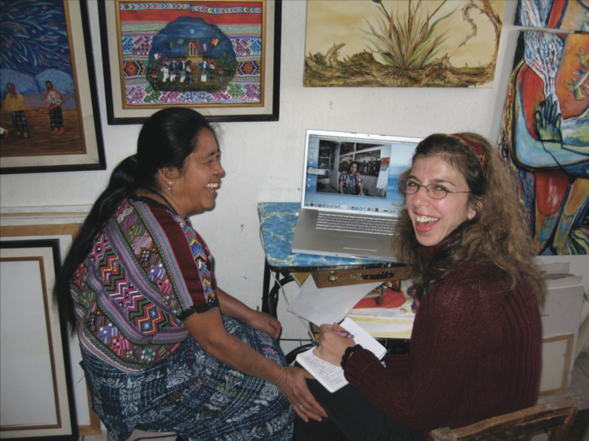 Paula and Kryssi, collaborative ethnography, editing a video together in Paula’s painting studio, San Juan Comalapa, 2011