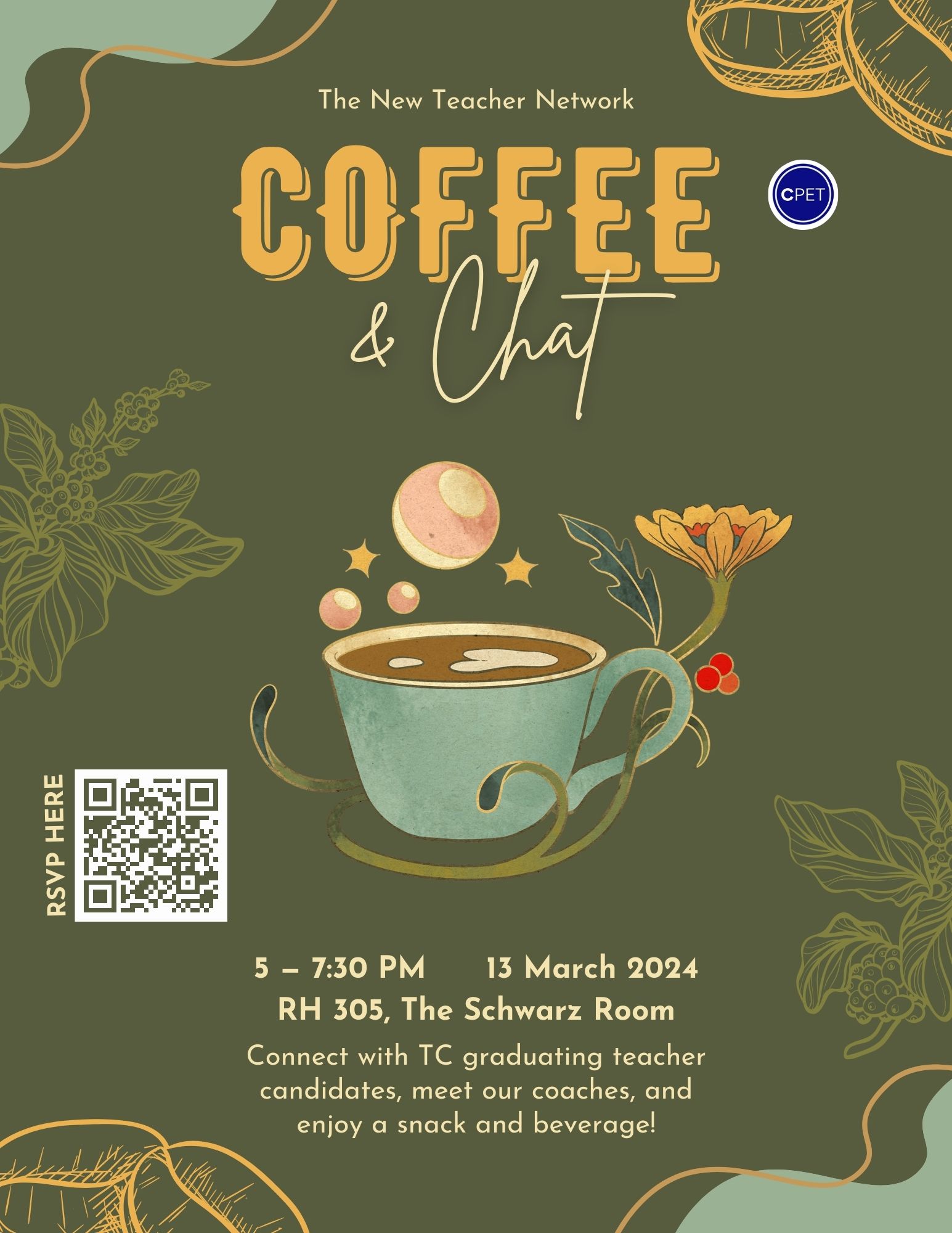 Join us at the New Teacher Network (NTN@TC) for a Coffee & Chat on Wednesday, March 13th from 5 - 7:30 PM in RH 305, The Schwarz Room—located in the library.