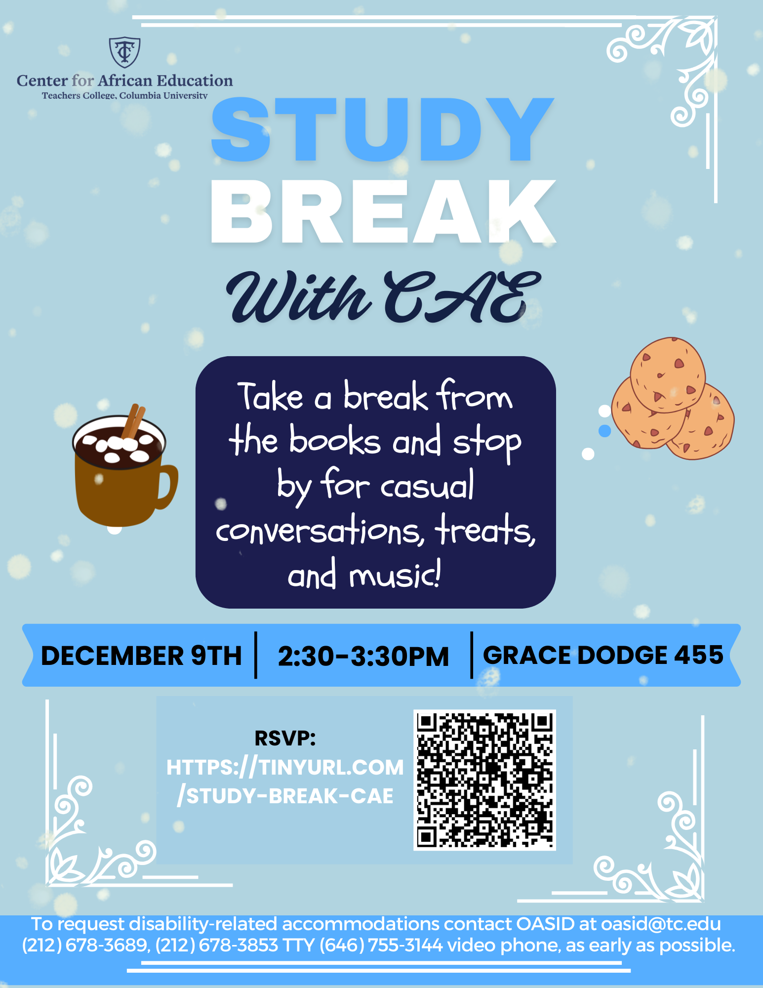 Join us at the Center for African Education for a study break! Take a break from the books and stop by for casual conversations, treats, and music while connecting with community!