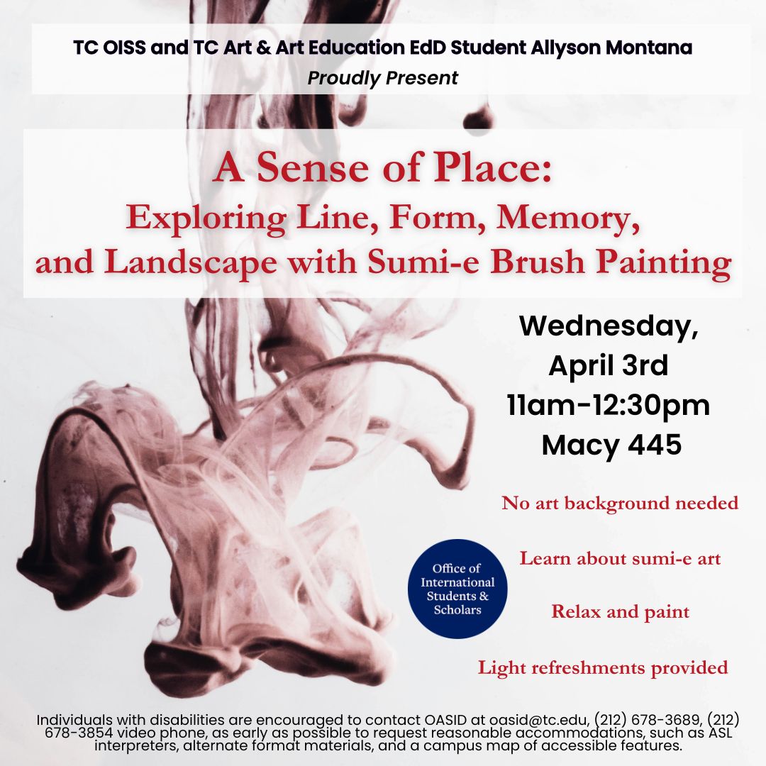 Join Art & Art Education EdD student Allyson Montana and the OISS to explore line, form, memory, and landscapes with Sumi-e brush painting in this fun workshop! No art background necessary! You’ll even have your own creation to bring home.