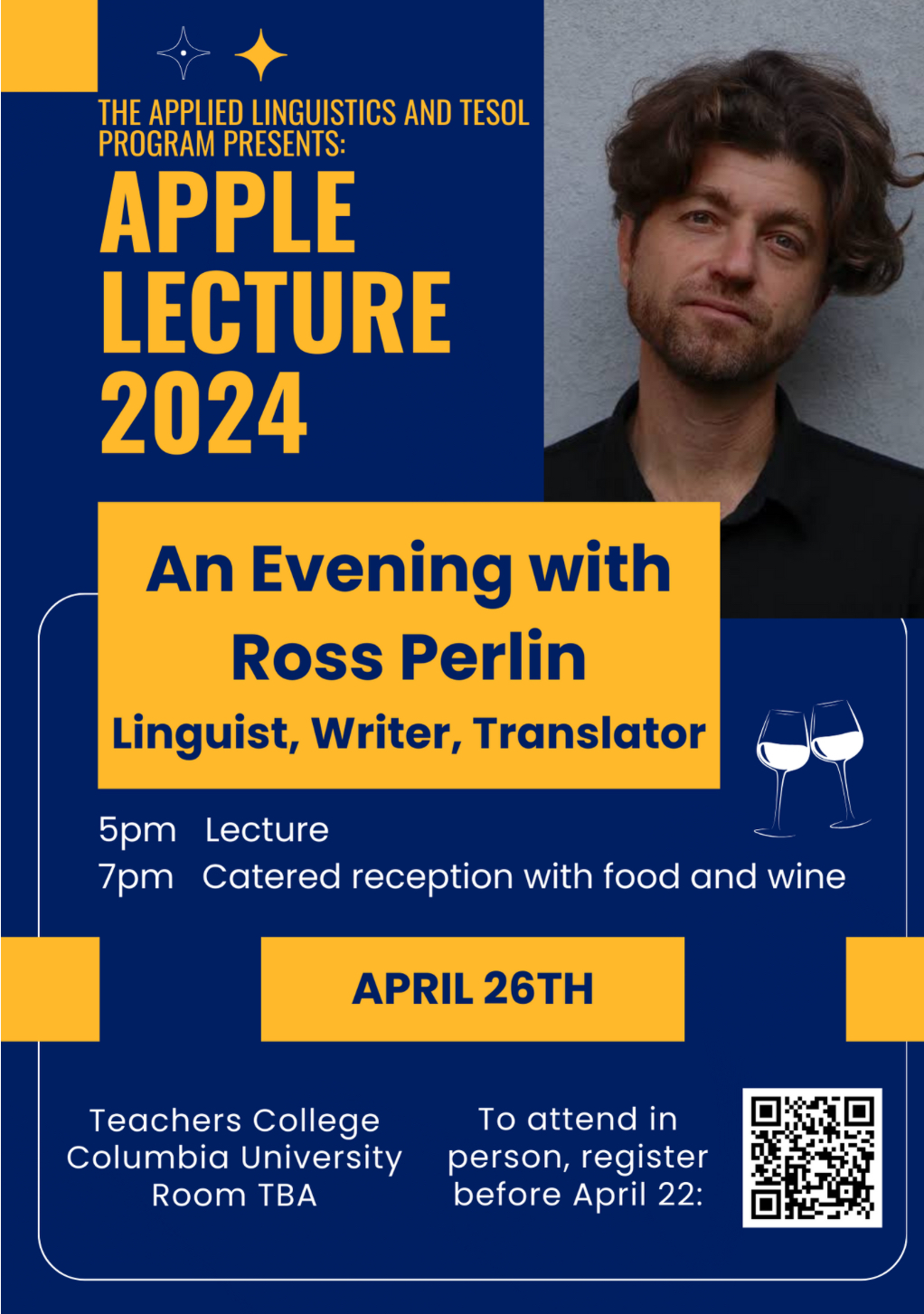It is my honor and pleasure to invite you to join us for APPLE Lecture 2024: An Evening with Ross Perlin! Dr. Perlin will treat us to a talk about his new book, Language City: The Fight to Preserve Endangered Mother Tongues in New York on Friday, April 26th, 2024 at 5pm. A reception with food and wine will follow at 7pm. The event will take place at Teachers College with the room to be announced before the event. Additionally, a Zoom link will be shared via email for online viewing.