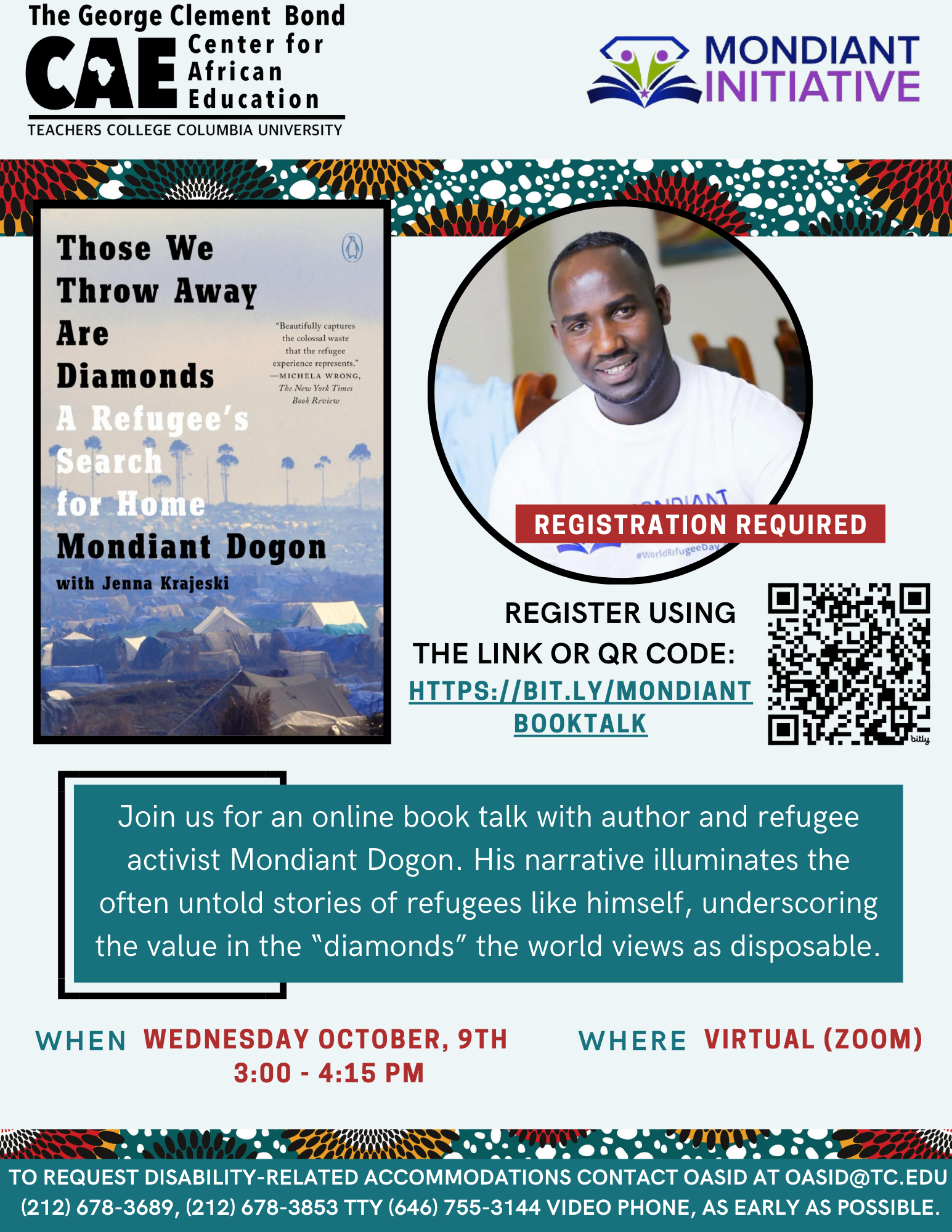Join us for an online book talk with author and refugee activist Mondiant Dogon. His narrative illuminates the often untold stories of refugees like himself, underscoring the value in the “diamonds” the world views as disposable.