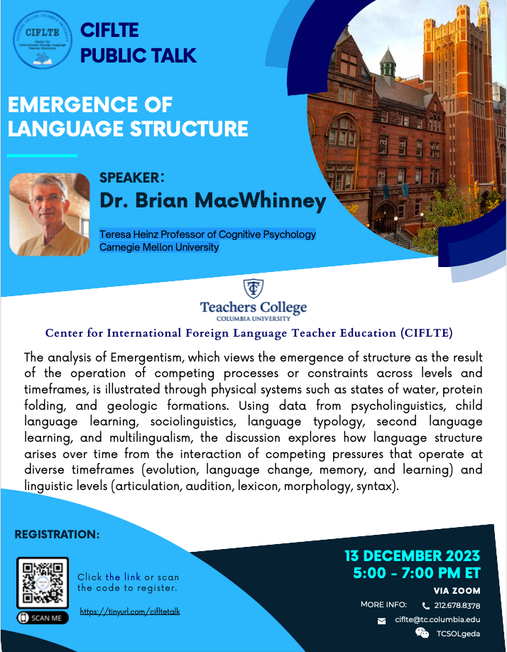 CIFLTE at TC, Columbia University is hosting a public talk by Dr. Brian MacWhinney from Carnegie Mellon University on Emergency of Language Structure. Please see the flyer for more information.