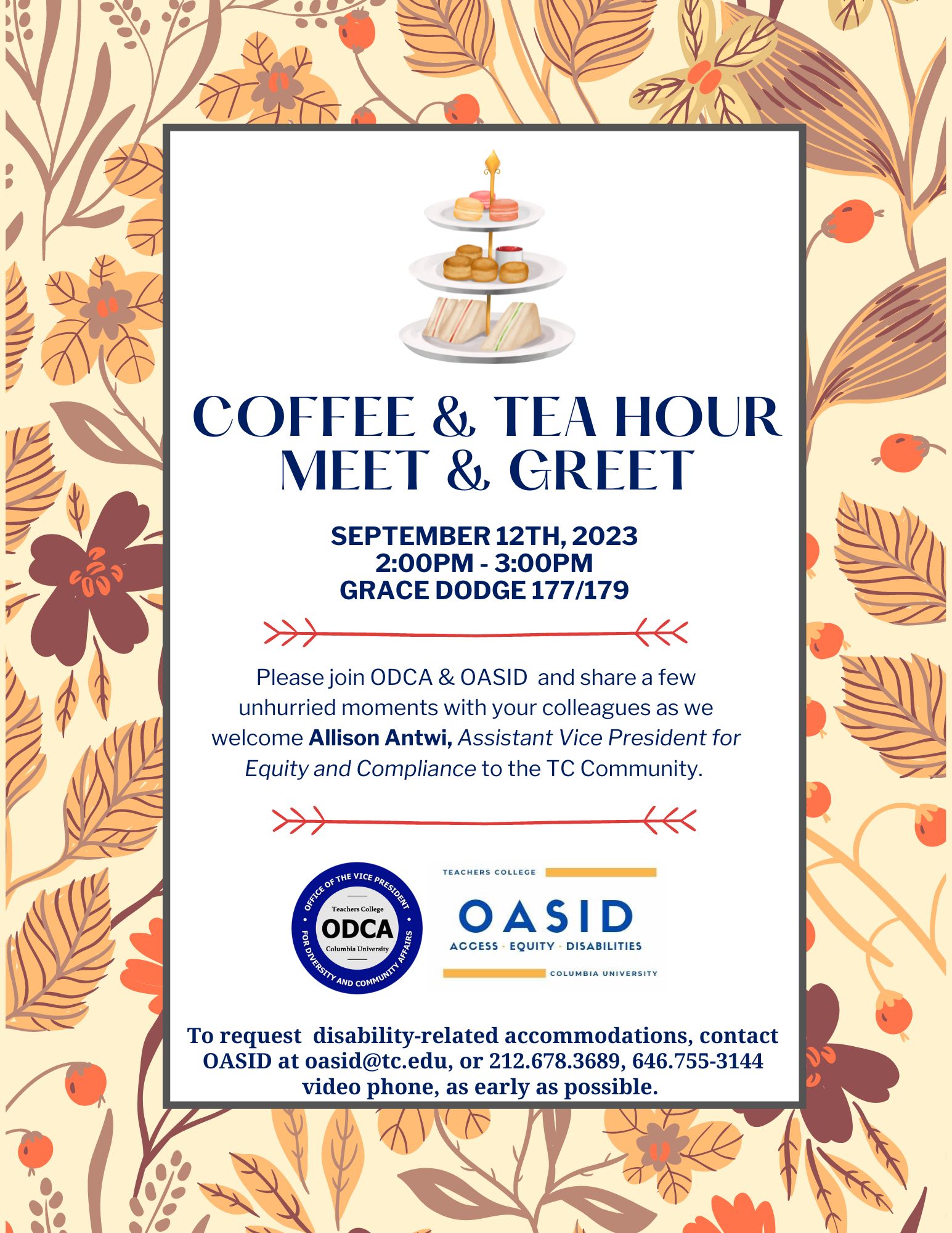 Please join ODCA & OASID and share a few unhurried moments with your colleagues as we welcome Allison Antwi, Assistant Vice President for Equity and Compliance to the TC Community.