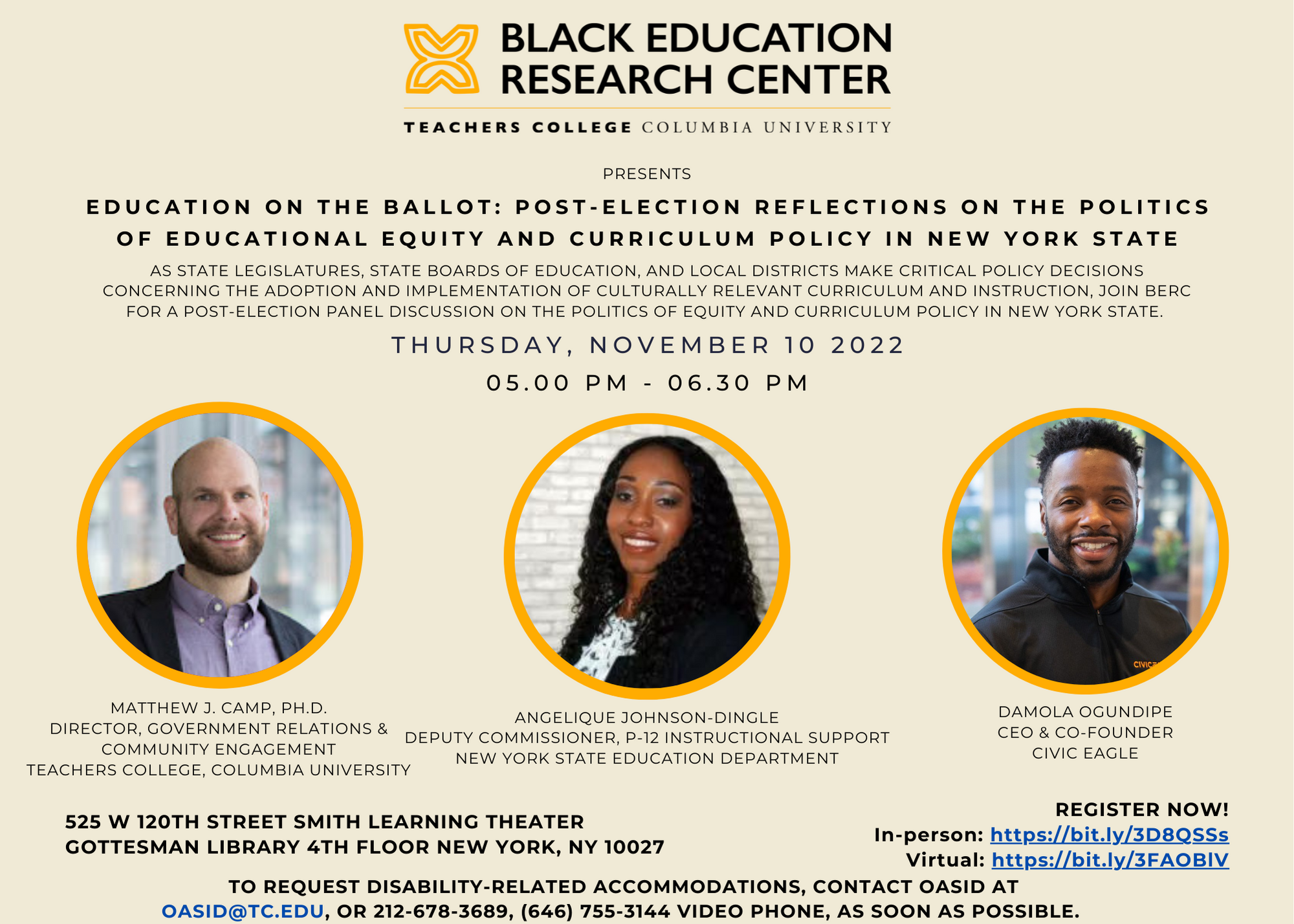 To request disability-related accommodations, contact OASID at oasid@tc.edu, or 212-678-3689, (646) 755-3144 video phone, as soon as possible.