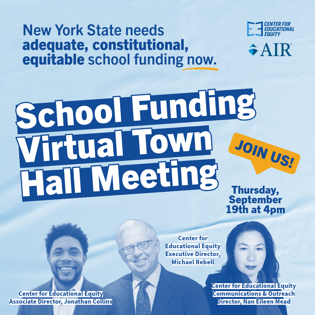 The Center for Educational Equity and the American Institutes for Research are launching a project to advance the development of a constitutional school funding formula for New York State to replace the current 18-year old Foundation Aid formula, which is outdated and unconstitutional. Our Adequate, Constitutional, Equitable (ACE) School Funding Project will conduct an independent study to begin a process to develop a new formula that will fulfill the state’s constitutional obligation to provide our students sufficient resources each year to truly meet their educational needs.
