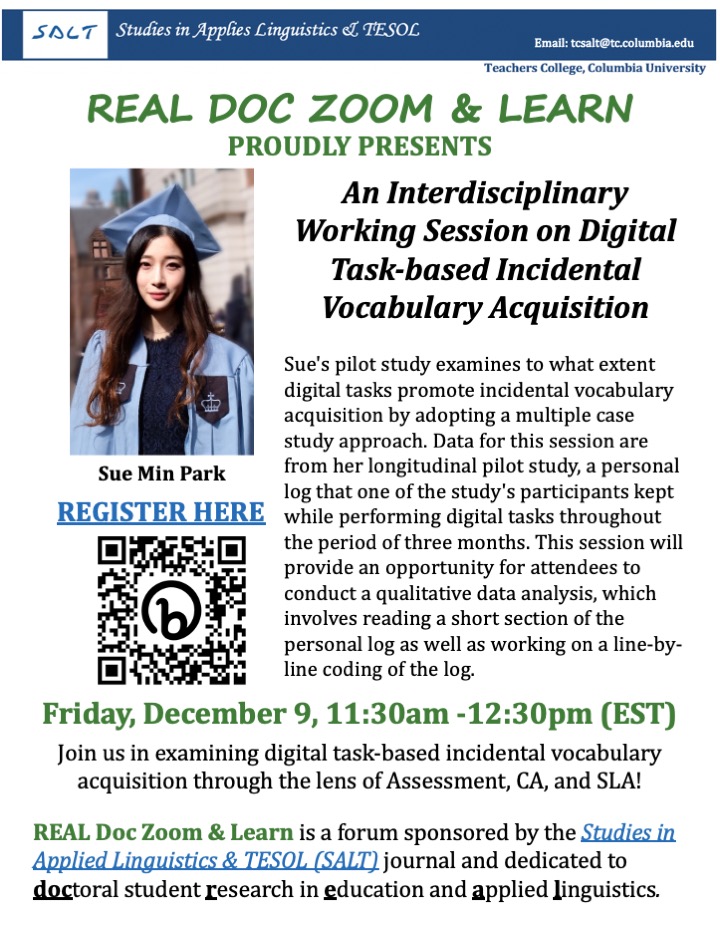 Studies in Applied Linguistics & TESOL (SALT) is hosting an Interdisciplinary Working Session at our next REAL Doc Zoom & Learn with Sue Min Park