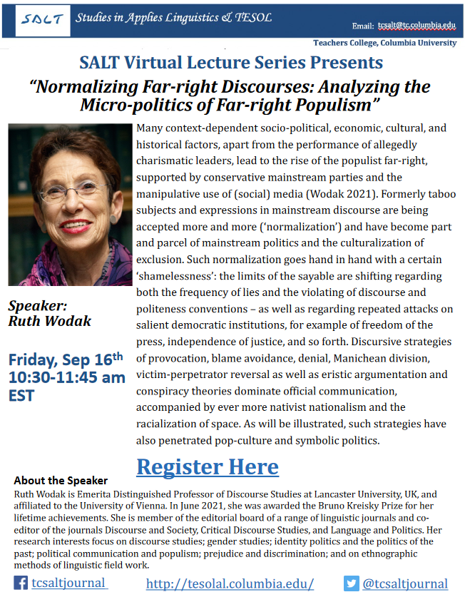 SALT Virtual Lecutre Series proudly presents Dr. Ruth Wodak Friday, September 16, 2022 from 10:30-11:45 AM EST. The title of the talk will be “Normalizing Far-right Discourses: Analyzing the Micro-politics of Far-right Populism.”