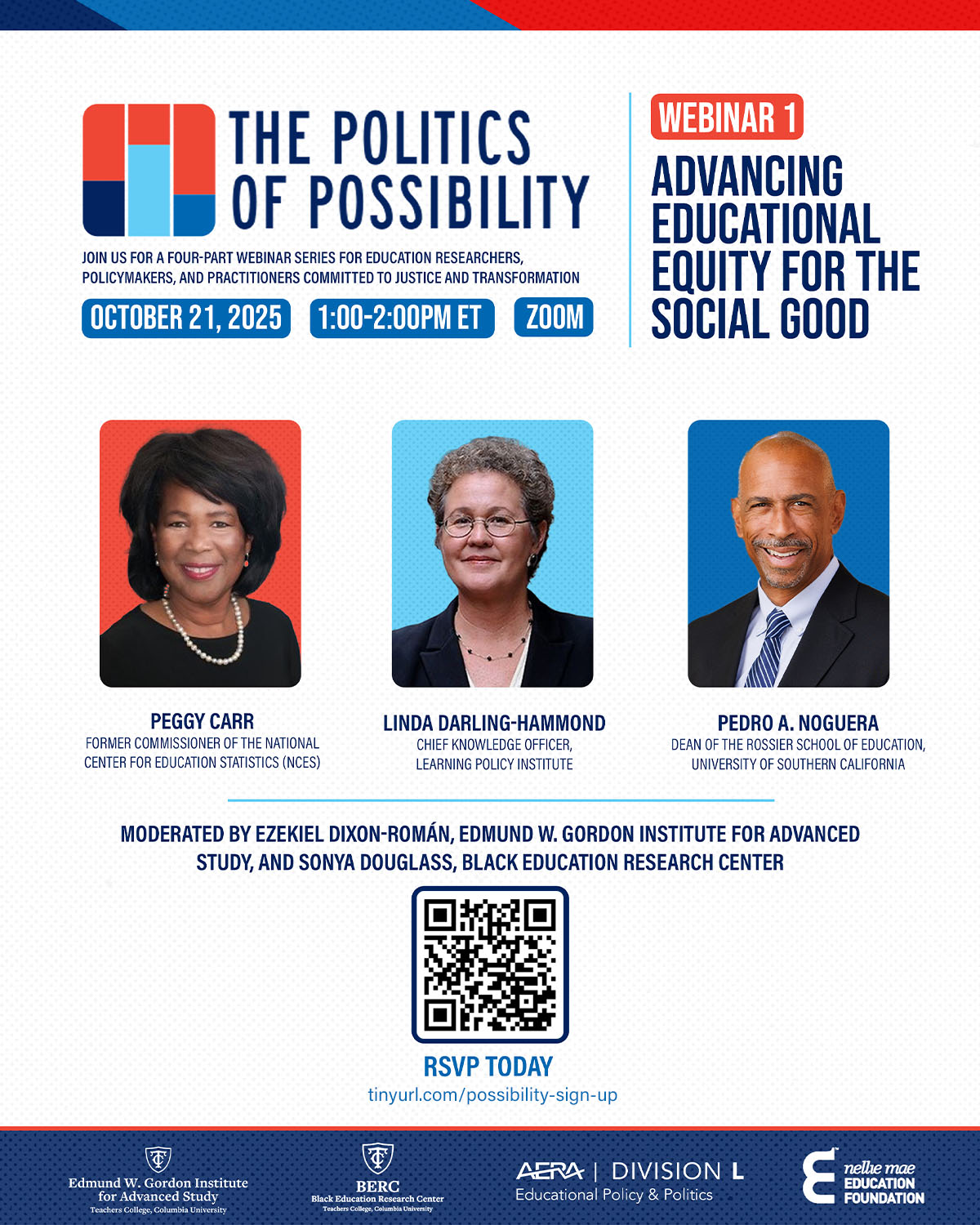 Attention K-12 and higher education researchers, policymakers and practitioners invested in equitable, evidence-informed education practice and policy. You are invited to The Politics of Possibility: Advancing Educational Equity for the Social Good webinar series, presented by the Edmund W. Gordon Institute for Advanced Study and the Black Education Research Center at Teachers College, Columbia University; The American Educational Research Association, Division L; and the Nellie Mae Education Foundation.