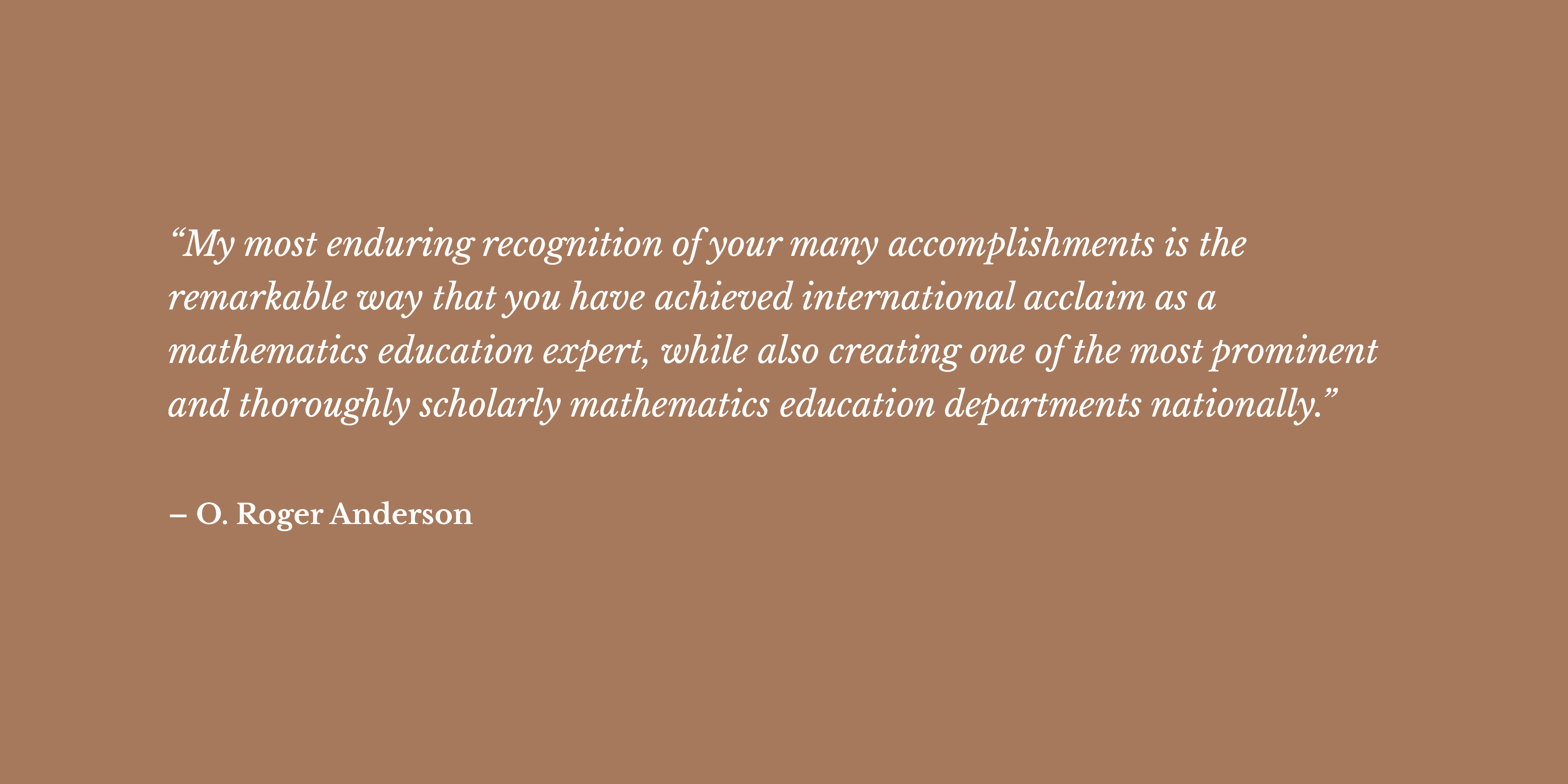 Dr. Vogeli’s service to the College included chairmanship of the Department of Mathematical Sciences in Education. Under his direction, the program has been the largest such graduate program in the nation and attracted students from throughout the world. Dr. Vogeli’s commitment to diversity and international collaboration led to cooperative relationships with universities in Africa, Asia, and South America. Consultations, meetings, guest lectures, Fulbright professorships—he has been invited all over the world to help with the development of mathematics education.