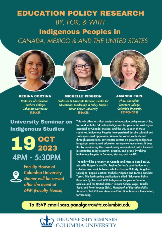 In addition to the publication, alongside the University Seminar on Indigenous Studies at Columbia University, chaired by Professor Pamela Calla (NYU) and Professor Elizabeth West Hutchinson (Barnard College), the research will be presented on Thursday, October 19 by two of the project scholars: Dr. Pidgeon and Dr. Cortina. Our ICEd Doctoral student, Sara Pan Algarra, serves as rapporteur of the University Seminar on Indigenous Studies, and has been co-leading the organization of this significant event.