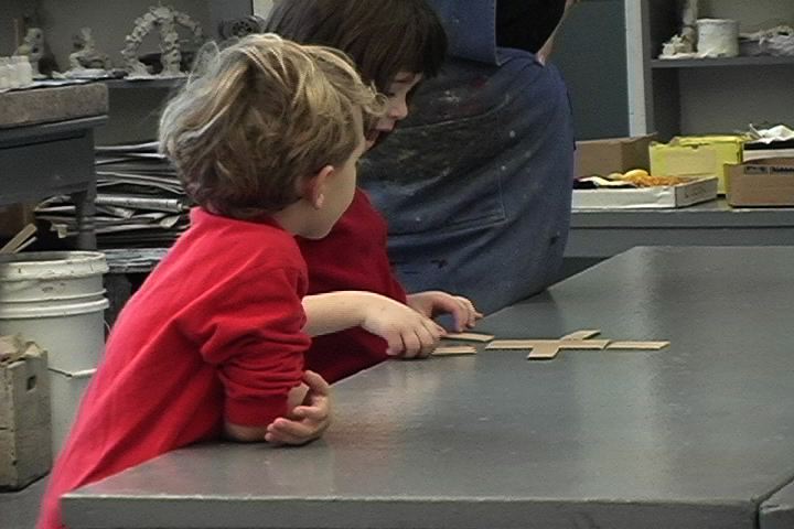 Each lesson falls within a year-long sequence of building up one skill upon another--Nancy establishes a foundation for the children before moving on to the next thing. She separates different art activities into lesson categories: collage, drawing, painting, clay, printmaking, construction and social studies. She reminds young children that last week they did one thing, and this week they're adding a new thing to what they know. She makes each step manageable by limiting the materials and tools they will work with. The stick puppet activity is crucial to the sequence of the year because it provides a foundation for the figurative work that the children will be doing throughout their artistic development. |