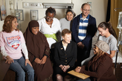 Elaine Tagliareni (seated, center) with nursing students (from left) Mary D’Ambra, Dana Wilks, Yavonda F. Williams, Susana Rodriguez, Giovanni Del Vecchio, Tracie Comuso and Tonya Cooper at the Community College of Philadelphia in October 2008. Photograph by Samantha Isom.