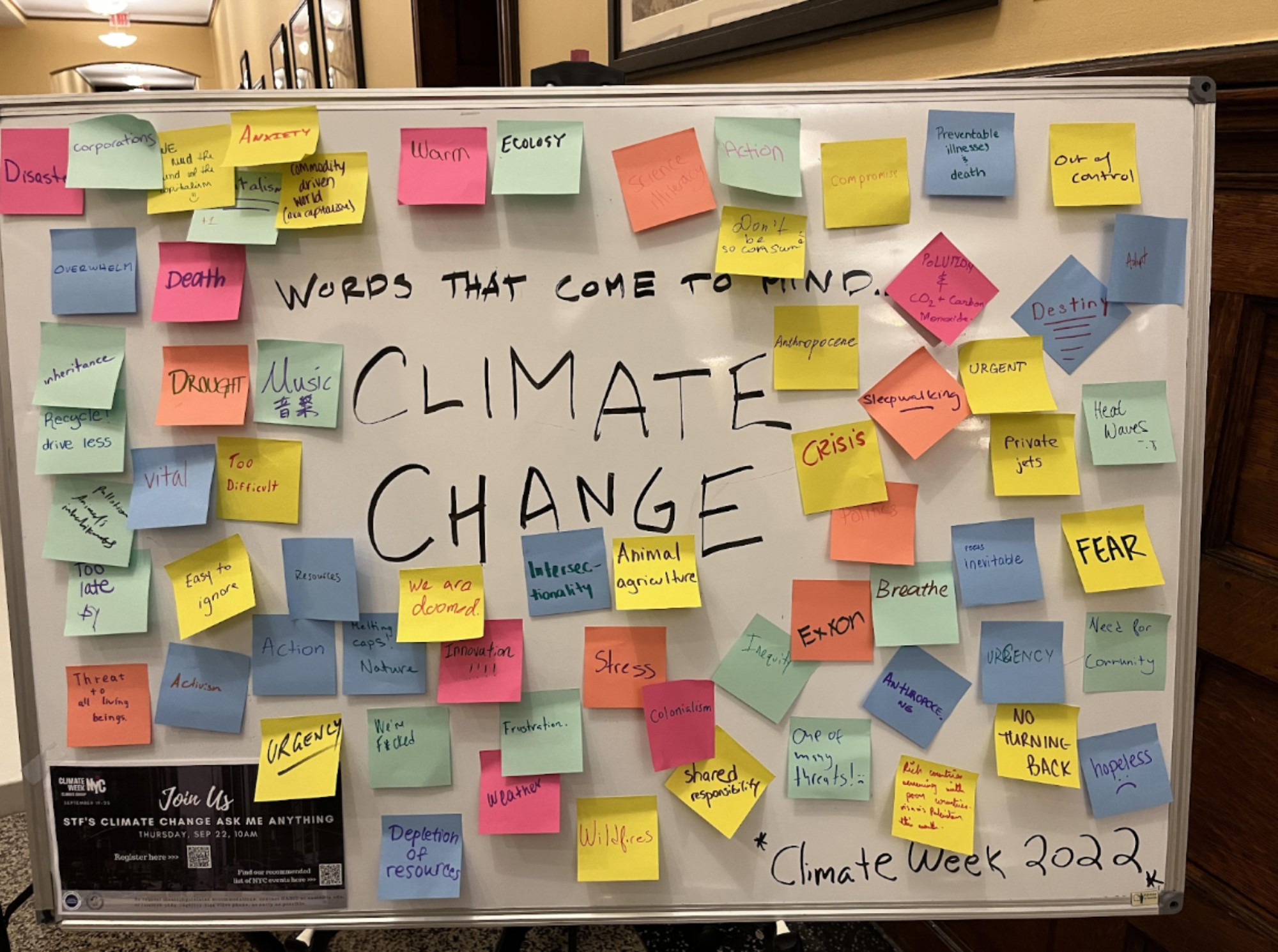 Our Climate Week kick-off showed that this climate anxiety is close to home, here at TC. It is clear from the prompt board responses and passing conversations we had during this event that we need spaces at TC where people can express these feelings in constructive ways. The next generation of educators, health professionals, and psychologists going to school at TC should be empowered through their time here to participate in climate action efforts. Hopelessness towards the climate crisis needs to be met with pathways to foster collective action. At TC this starts with us looking at the ways we address climate change, climate anxiety, and sustainability within our community to set an example for our student body and other graduate schools of education, health, and psychology.